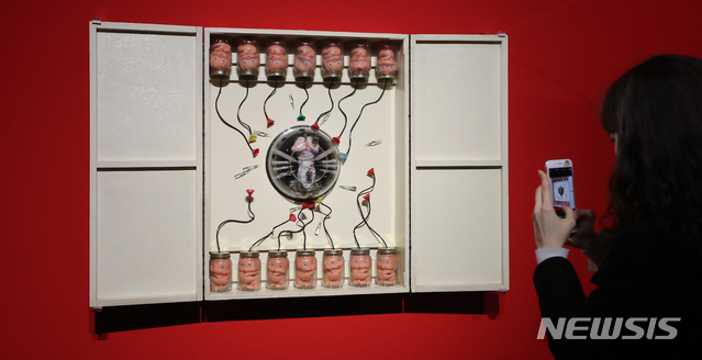 【과천=뉴시스】조수정 기자 = 30일 오전 과천시 막계동 국립현대미술관 과천관에서 열린 '세상에 눈뜨다 : 아시아 미술과 사회 1960s-1990s' 전시 언론간담회에서 참석자들이 소비 자본주의를 비판하는 쿠도 테츠미 작가의 작품 '당신의 우상'을 둘러보고 있다. 20세기 중후반 아시아 현대미술을 사회 관계 속에서 조망하는 국제기획전 '세상에 눈뜨다 : 아시아 미술과 사회 1960s-1990s'는 31일부터 5월 6일까지 과천관 1,2 전시실과 중앙홀에서 열린다. 2019.01.30. [email protected]