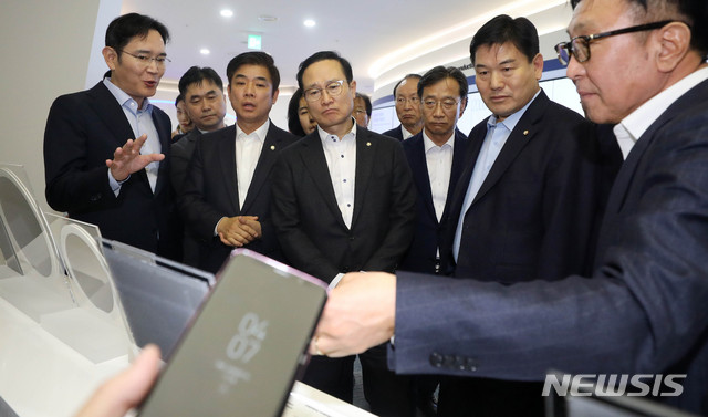 【화성=뉴시스】추상철 기자 = 30일 오후 경기 화성시 삼성전자 화성캠퍼스 나노시티에서 홍영표 더불어민주당 원내대표를 비롯한 의원들이 이재용 삼성전자 부회장과 함께 반도체 박물관을 둘러보고 있다. 2019.01.30.