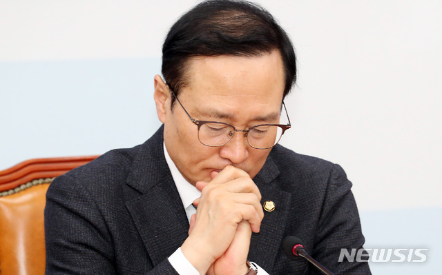 【서울=뉴시스】이종철 기자 = 31일 서울 여의도 국회에서 열린 더불어민주당 정책조정회의에서 홍영표 원내대표가 '김경수 법정구속'에 대한 모두발언을 하면서 곤혹스러워 하고 있다. 2019.01.31.