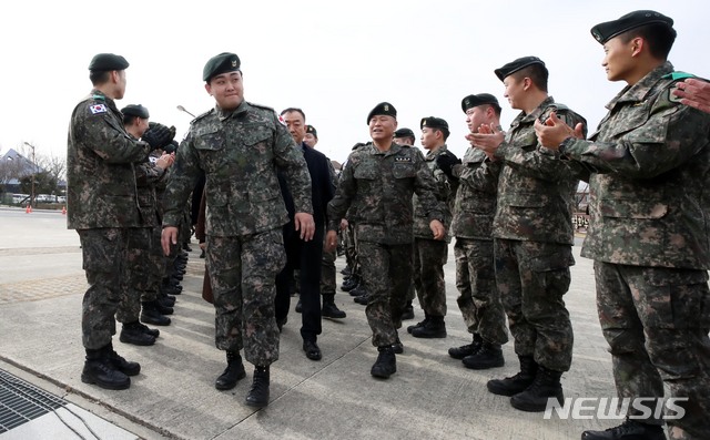 【파주=뉴시스】 고범준 기자 = 31일 오후 경기도 파주시 임진각 '평화의 발'에서 열린 하재헌 중사 전역 기념행사에서 하재헌 중사가 입장하고 있다.