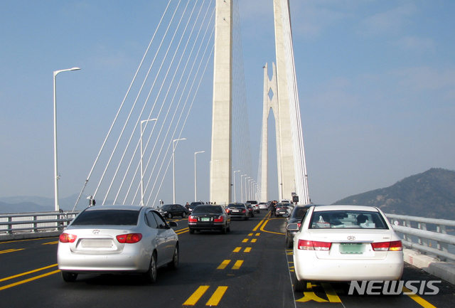 【신안=뉴시스】박상수 기자 = 2일 오전 전남 신안군 압해도와 암태도를 연결하는 '천사대교'가 차량들로 북적이고 있다. 천사대교는 설 연휴를 맞아 1일부터 7일까지 임시개통한다. 2019.02.02.
