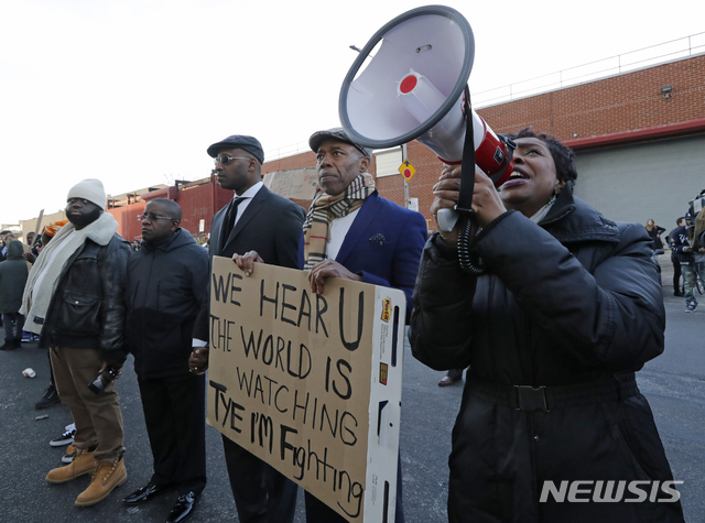 【뉴욕=AP/뉴시스】3일(현지시간) 미 뉴욕 브루클린 보로홀의 메트로폴리탄 교도소 밖에서 이베트 클라크(오른쪽) 민주당 의원과 브루클린 보로홀 에릭 애덤스 대표와 함께 수감 중인 재소자들에게 격려 메시지를 보내고 있다.