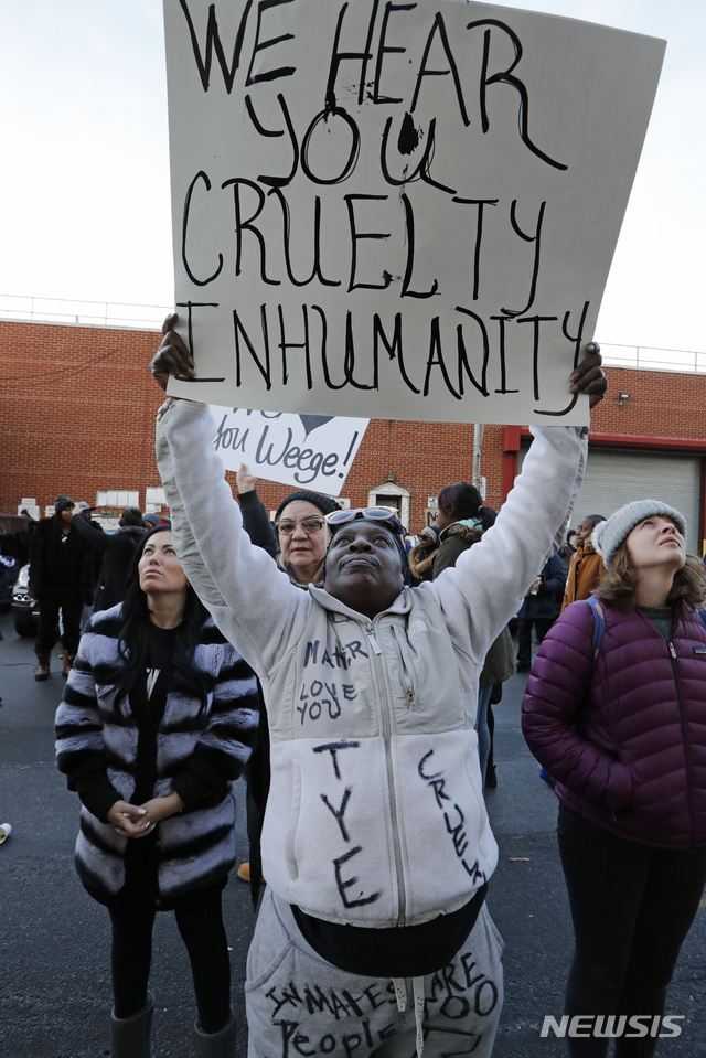 연방 시설인 이곳 재소자들은 최근 닥친 한파와 함께 전기 설비 고장으로 지난주 초부터 근 일주일간 전기는 물론 난방, 온수, 위생 설비 등을 사용하지 못해 재소자 가족, 친지 등이 이의 개선을 요구하는 시위를 벌이고 있다. 2019.02.04.