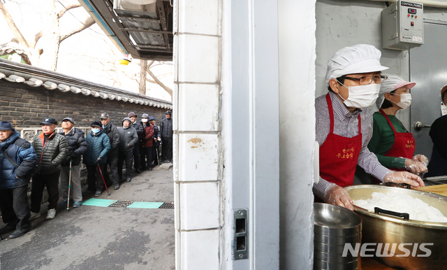 【서울=뉴시스】김병문 수습기자 = 황교안 전 국무총리가 4일 오전 서울 종로구 사회복지원각에서 어르신들에게 무료 급식 봉사를 하고 있다. 2019.02.04.