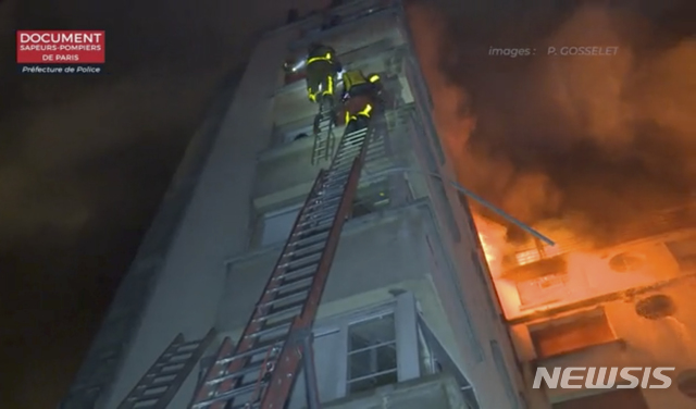 【파리=AP/뉴시스】5일 새벽(현지시간) 프랑스 파리의 8층짜리 아파트 건물에서 화재가 발생해 소방대원들이 불이 난 꼭대기 층으로 오르기 위해 사다리를 설치하고 있다. .