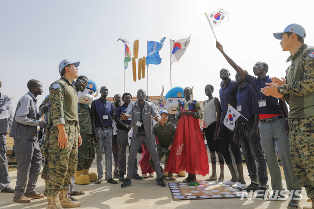 【서울=뉴시스】최동준 기자 = 합동참모본부가 설날을 맞아 5일 해외파병부대의 연휴간 활동에 대해 소식을 전했다. 사진은 한빛부대 장병들이 현지 남수단 주민들과 윷놀이를 하는 모습. 2019.02.05. (사진=합동참모본부 제공)