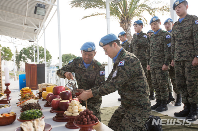 【서울=뉴시스】최동준 기자 = 합동참모본부가 설날을 맞아 5일 해외파병부대의 연휴간 활동에 대해 소식을 전했다. 사진은 동명부대 장병들이 합동차례를 지내는 모습. 2019.02.05. (사진=합동참모본부 제공)