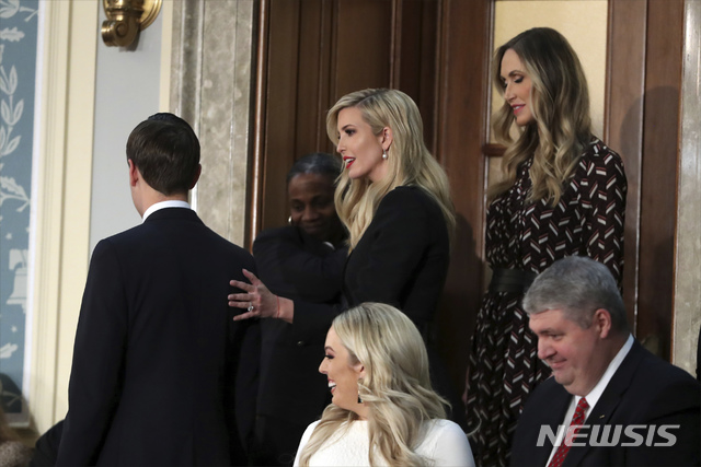 【워싱턴=AP/뉴시스】이방카 트럼프(가운데 서있는 사람) 등 도널드 트럼프 미국 대통령 가족들이 5일(현지시간) 국정연설을 듣기 위해 워싱턴 국회의사당 방청석에 들어서고 있다.2019.02.06