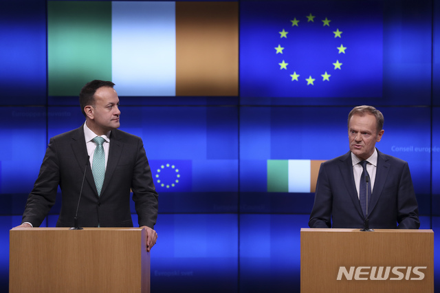 【브뤼셀=AP/뉴시스】도날트 투크스 유럽연합(EU) 정상회의 상임의장(오른쪽)이 6일(현지시간) 벨기에 브뤼셀을 방문한 레오 바라드카르 아일랜드 총리와 공동 기자화견을 하고 있다. 2019.02.07