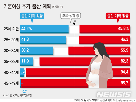 【서울=뉴시스】7일 한국보건사회연구원의 '자녀 출산 실태와 정책 함의' 보고서에 따르면 2018년 전국 출산력 및 가족보건·복지 실태조사 결과 향후 출산 계획이 있는 유배우 여성 비율은 25세 미만에서 44.2%로 가장 높았다가 30~34세 때 30.2%까지 서서히 낮아진 뒤 35~39세 때 3분의 1 수준인 11.9%까지 급감했다. (그래픽=전진우 기자)
