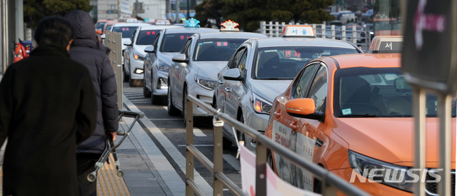 【서울=뉴시스】홍효식 기자 = 서울시가 노사민전정 협의체·공청회·물가대책위원회와 시의회 의견 청취 등을 거쳐 오는 16일 오전 4시부터 택시 기본요금을 3000원에서 3800원으로 인상한다고 밝힌 가운데 7일 오전 서울역 택시승강장에서 택시들이 승객을 태우기 위해 줄지어 있다.