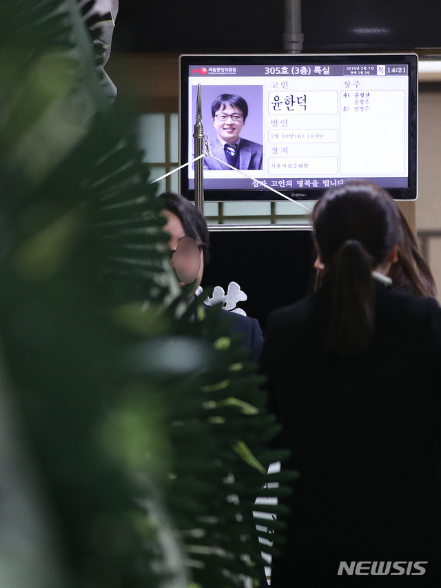 【서울=뉴시스】박미소 수습기자 = 7일 오후 응급의료서비스 체계에 앞장선 고 윤한덕 중앙응급센터장의 빈소가 마련된 서울 중구 국립중앙의료원 장례식장에 빈소 안내문이 보이고 있다. 고 윤한덕 센터장은 응급의료 전용헬기(닥터헬기) 도입 등을 추진하며 응급의료서비스 체계 구축에 앞장 선 인물이다. 2019.02.07.