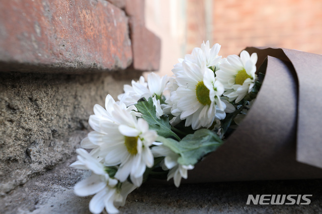 【서울=뉴시스】박미소 수습기자 = 7일 오후 서울 중구 국립중앙의료원의 중앙응급의료센터장실 앞에 고 윤한덕 중앙응급의료센터장을 기리는 꽃이 놓여있다. 고 윤한덕 센터장은 응급의료 전용헬기(닥터헬기) 도입 등을 추진하며 응급의료서비스 체계 구축에 앞장 선 인물이다. 2019.02.07.
