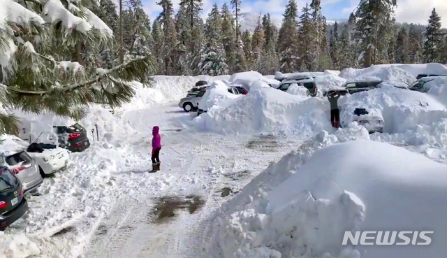 사진은 5일 킹스캐니언 국립공원 세코이어 로지 주차장에서 관광객들이 눈에 파묻힌 자동차의 눈을 치우는 모습. 2019.02.09.