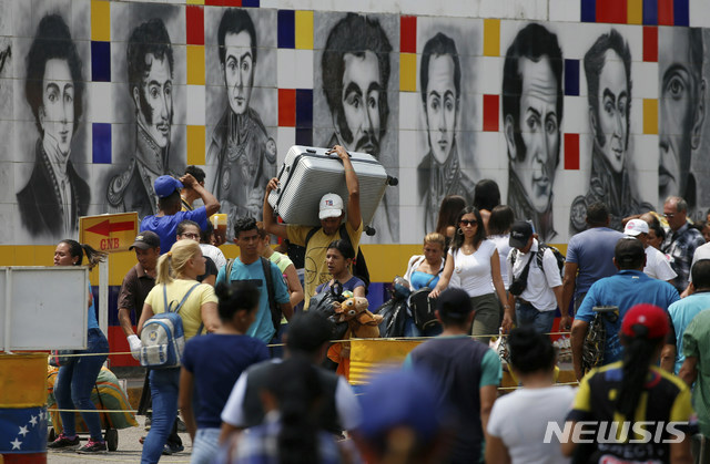 【쿠쿠타=AP/뉴시스】8일(현지시간) 베네수엘라 국경을 걸어 넘은 베네수엘라인들이 콜롬비아 쿠쿠타 티엔디타스 다리 근처 미국 구호 물품 배급소에서 물품을 받아 자국으로 돌아가고 있다.