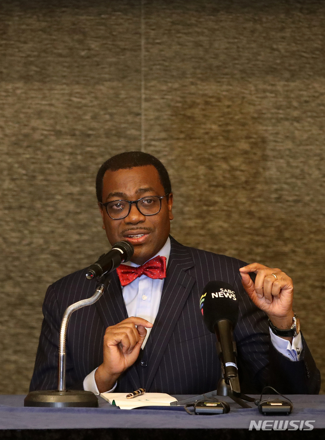 【서울=뉴시스】김선웅 기자 = 제3회 선학평화상 수상자인 아킨우미 아데시나 아프리카개발은행 총재가 9일 서울 송파구 잠실 롯데호텔에서 시상식을 앞두고 열린 기자회견에서 질문에 답변을 하고 있다.
