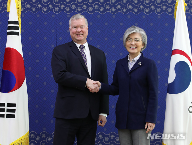 【서울=뉴시스】최진석 기자 = 북한 평양서 2박 3일간 실무협상을 마치고 돌아온 스티븐 비건 미국 국무부 대북정책 특별대표가 협상 결과 설명을 위해 9일 오전 서울 종로구 도렴동 외교부를 방문해 강경화 장관과 기념촬영하고 있다. 2019.02.09.