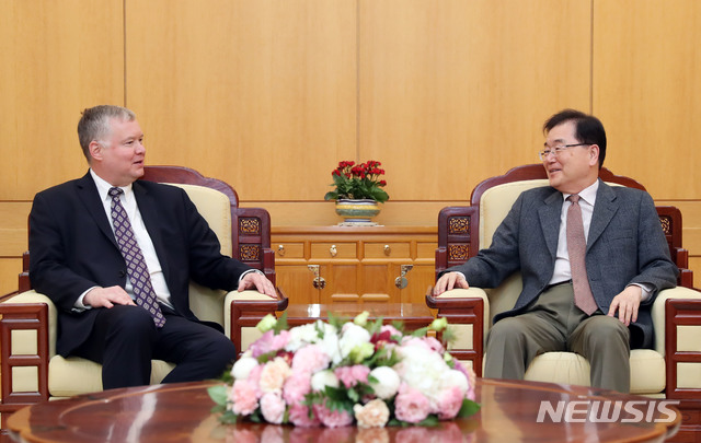 【서울=뉴시스】전신 기자 = 정의용 청와대 국가안보실장이 9일 오후 청와대 본관 백악실에서 스티븐 비건 미국 국무부 대북특별대표와 면담을 하고 있다. 2019.02.09. (사진=청와대 제공)