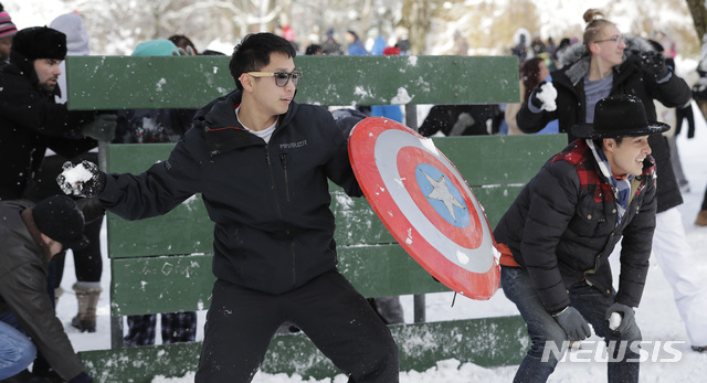 【타코마=AP/뉴시스】9일(현지시간) 미 워싱턴주 타코마의 라이트공원에서 눈싸움대회가 열려 참가자들이 눈싸움을 하고 있다.