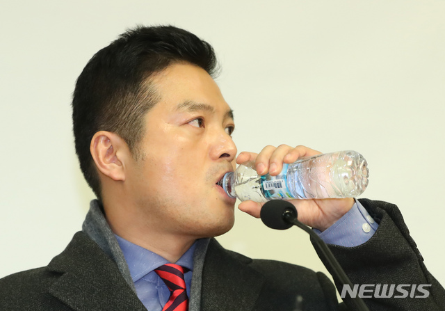 【서울=뉴시스】고승민 기자 = 청와대 특별감찰반 근무 중 알게 된 비밀을 누설한 혐의로 고발돼 검찰 소환수사를 앞둔 김태우 전 수사관이 10일 오후 서울 여의도 국회 의원회관에서 기자회견을 열고 드루킹 특검 당시 상황 등 추가 내용을 주장하고 있다. 2019.02.10.
