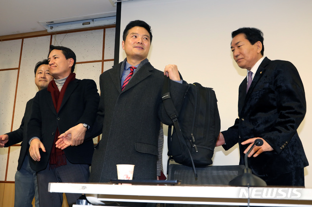 【서울=뉴시스】고승민 기자 = 청와대 특별감찰반 근무 중 알게 된 비밀을 누설한 혐의로 고발돼 검찰 소환수사를 앞둔 김태우 전 수사관이 10일 오후 서울 여의도 국회 의원회관에서 기자회견을 열고 드루킹 특검 당시 상황 등 추가 내용을 주장한 뒤 자유한국당 안상수, 김진태 의원, 김용남 전 의원, 바른미래당 이언주 의원에게 격려받으며 퇴장하고 있다. 2019.02.10.