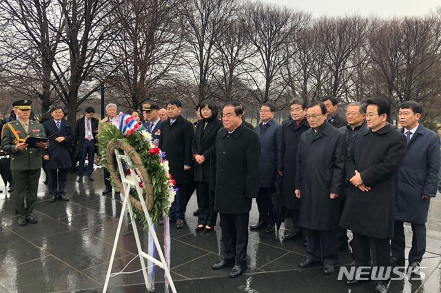 【워싱턴 D.C.=뉴시스】한주홍 기자 = 미국을 공식 방문 중인 문희상 국회의장과 여야 지도부가 11일(현지시간) 미국 워싱턴 D.C의 한국전 기념공원을 찾아 헌화하고 있다. 2019.02.12.