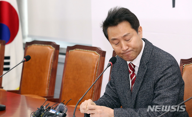 【서울=뉴시스】이종철 기자 = 12일 서울 여의도 국회에서 자유한국당 대표에 출마한 오세훈 전 서울시장이 기자회견을 갖고 보이콧을 철회하고 당 대표에 출마한다고 밝히면서 심각한 표정을 하고있다. 2019.02.12.