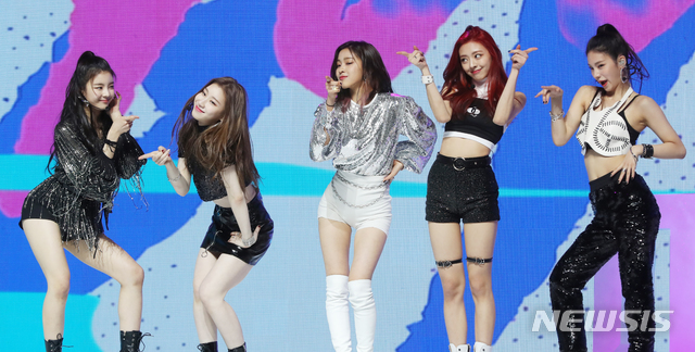 【서울=뉴시스】조수정 기자 = JYP 신인 걸그룹 있지(ITZY)가 12일 오후 서울 한남동 블루스퀘어 아이마켓홀에서 데뷔 쇼케이스를 하고 있다. 왼쪽부터 리아, 채령, 류진, 유나, 예지. 2019.02.12. [email protected]