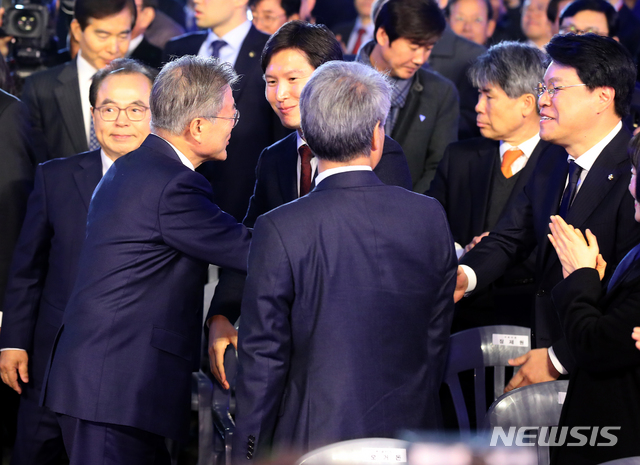 【부산=뉴시스】전신 기자 = 문재인 대통령이 13일 부산 사상구 철강선 제조업체인 대호피앤씨 부산 공장에서 열린 대한민국 도시 미래, 부산 대개조 비전선포식에서 입장하며 자유한국당 장제원 의원과 인사하고 있다. 2019.02.13.