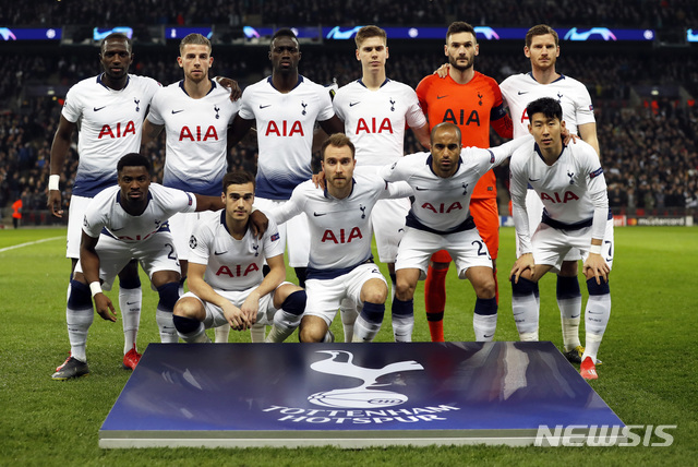 【런던=AP/뉴시스】손흥민(앞줄 오른쪽)을 비롯한 토트넘 선수들이 13일(현지시간) 영국 런던의 웸블리 스타디움에서 열린 2018~2019 UEFA 챔피언스리그 16강 도르트문트(독일)와의 1차전 경기에 앞서 기념촬영을 하고 있다.