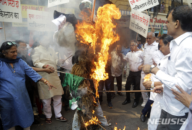 【뭄바이=AP/뉴시스】15일(현지시간) 인도 뭄바이에서 인도인민당 당원들이 전날 인도령 카슈미르주 스리나가르에서 발생한 경찰 버스 자살폭탄 테러에 분노해 파키스탄을 상징하는 허수아비를 불에 태우고 있다.