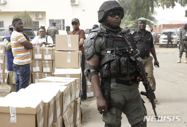 【욜라(나이지리아)=AP/뉴시스】나이지리아 대선을 하루 앞둔 15일(현지시간) 욜라의 나이지리아 선거관리위원회에서 관계자들이 각 투표소로 보내는 투표용지를 트럭에 싣는 동안 무장 경찰이 삼엄하게 주변을 경계하고 있다. 2019.02.15.