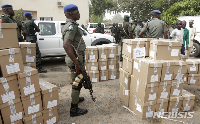 【욜라(나이지리아)=AP/뉴시스】나이지리아 대선을 하루 앞둔 15일(현지시간) 욜라의 나이지리아 선거관리위원회에서 관계자들이 각 투표소로 보내는 투표용지를 트럭에 싣는 동안 무장 경찰이 삼엄하게 주변을 경계하고 있다. 2019.02.15.