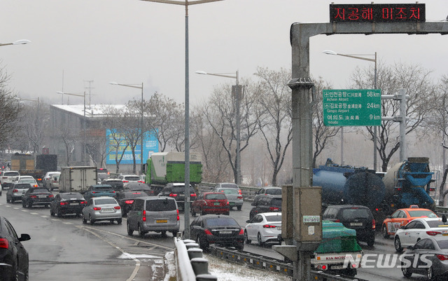 【서울=뉴시스】배훈식 기자 = 미세먼지 저감 및 관리에 관한 특별법(미세먼지 특별법)'과 '서울특별시 미세먼지 저감 및 관리에 관한 조례(미세먼지 조례)'가 전면 시행된 15일 오전 서울 서초구 반포대교 남단 인근 올림픽대로 전광판에 저공해 미조치 차량 단속을 알리는 문구가 나오고 있다. 2019.02.15.