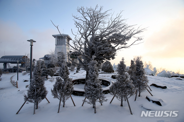 【평창=뉴시스】김경목 기자 = 16일 오전 강원 평창군 용평리조트 발왕산(해발 1458m) 드래곤피크 하늘정원이 밤새 날린 눈이 주목 등에 얼어붙어 겨울 풍경을 보여주고 있다. 2019.02.16.