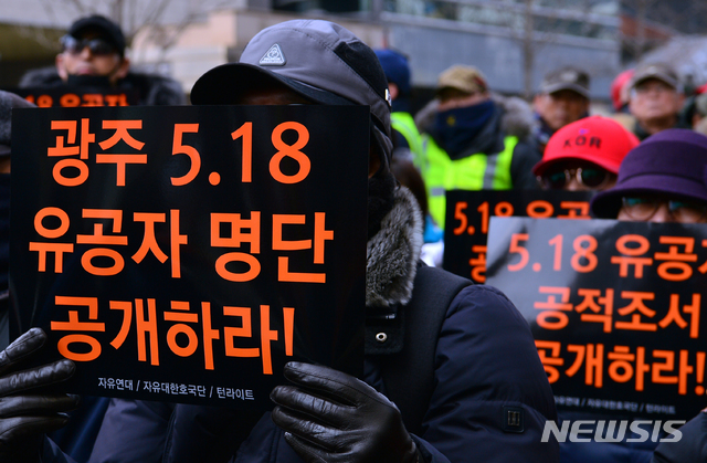 【광주=뉴시스】변재훈 기자 = 보수단체인 자유연대가 16일 오후 광주 동구 금남로 일원에서 회원 250여명(주최측 추산)이 모인 가운데 5·18 유공자 명단공개를 주장하는 집회를 열고 있다. 2019.02.16.