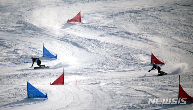 【평창=뉴시스】김경목 기자 = 2019 국제스키연맹(FIS) 스노보드 월드컵 평창 첫날 대회가 16일 오후 강원 평창군 봉평면 휘닉스 평창 평창동계올림픽 공식 코스 일명 이상호 슬로프에서 열린 가운데 여자 평행대회전(Parallea Giant Slalom, PGS) 예선전일 진행되고 있다.