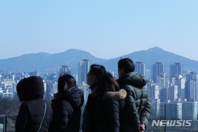 【서울=뉴시스】이윤청 수습기자 = 전국이 대체로 맑고 미세먼지 농도가 '보통' 수준을 보인 17일 서울 마포구 하늘공원에서 시민들이 서울 전경을 바라보고 있다. 2019.02.17.