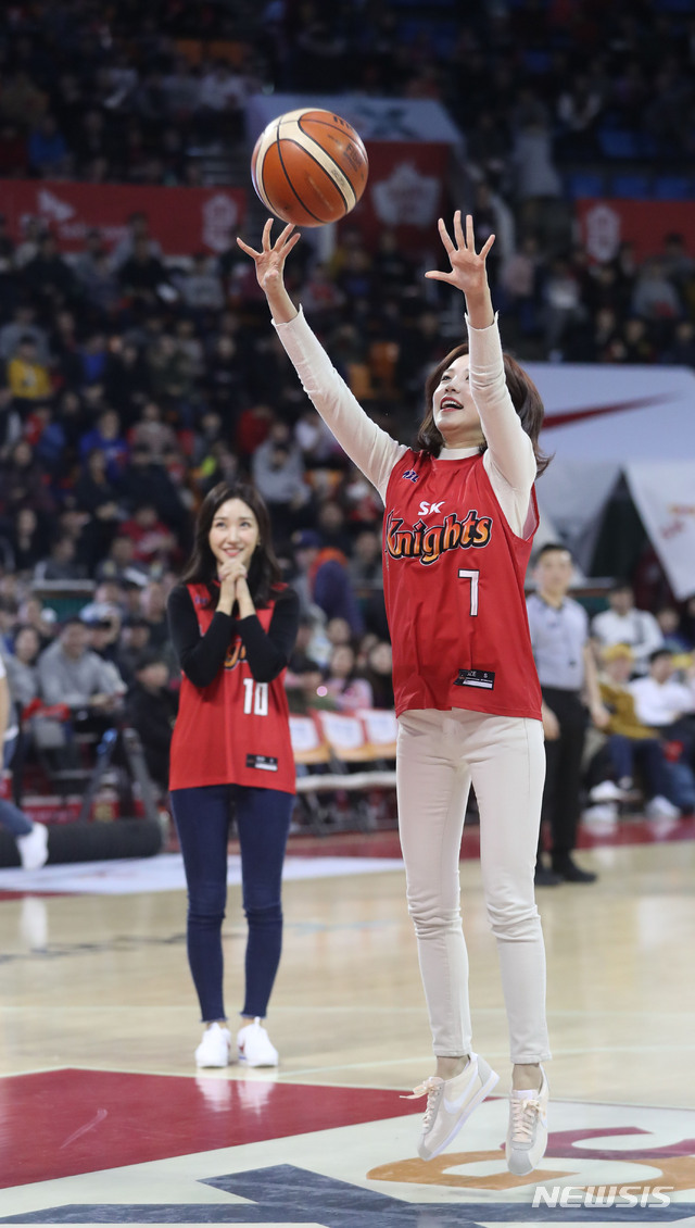 【서울=뉴시스】홍효식 기자 = 17일 오후 서울 송파구 잠실학생체육관에서 열린 2018-2019 SKT 5GX 프로농구 서울 SK 나이츠 부산 KT 소닉붐의 경기, 장예원 아나운서가 시투하고 있다. 2019.02.17.