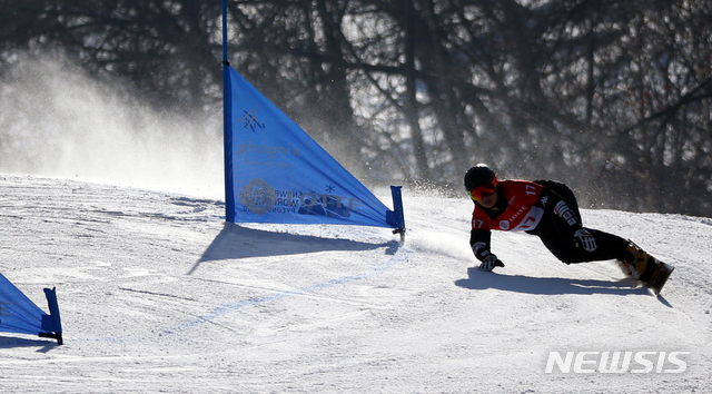 【평창=뉴시스】김경목 기자 = 2018 평창동계올림픽 은메달리스트 배추보이 이상호 선수가 17일 오후 강원 평창군 휘닉스 평창 스노우파크 평창올림픽 공식 코스 이상호 슬로프에서 열린 '2019 국제스키연맹(FIS) 스노보드 월드컵 평창' 둘째 날 대회 마지막 남자 평행대회전(Parallea Giant Slalom, PGS) 3.4위전에서 슬로프를 질주하고 있다.