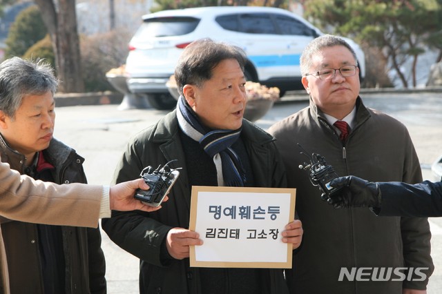 【춘천=뉴시스】박종우 기자 = 강원 5·18 민주화운동동지회 최윤(강원대학교 영어교육과 76학번)회장이 김래용 회원, 정선 변호사와 함께 18일 오전 강원 춘천시 춘천지방검찰청을 찾아 최근 5·18 북한군 개입 관련 발언을 한 자유한국당 김진태 의원을 고소하면서 취재진의 질문에 답하고 있다. 2019.02.18.