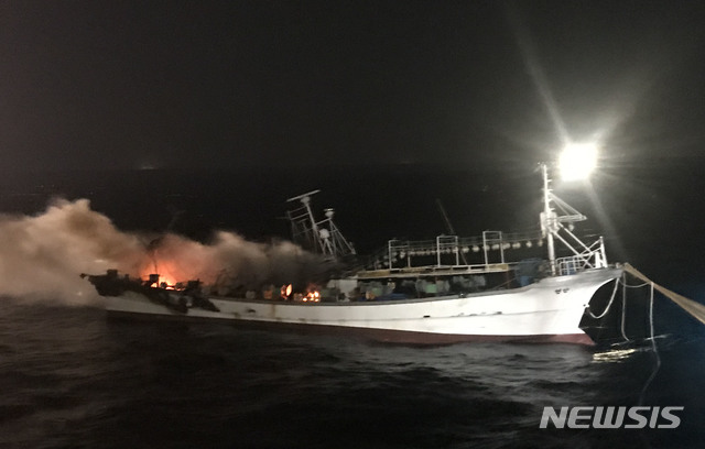 【서울=뉴시스】조성봉 기자 = 17일 울진 동방 41해리(75km)해상에서 조업 중이던 채낚기 어선 A호(29톤 승선원 5명)에 화재가 발생, 포항해경이 경비함정과 항공기 등을 현장으로 급파해 긴급 구조, 진화작업을 펼치고 있다.