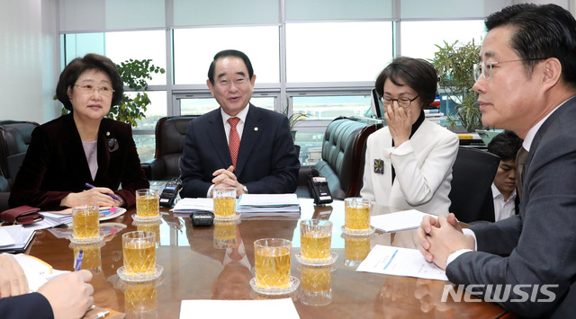 【서울=뉴시스】박영태 기자 = 18일 오전 서울 영등포구 여의도 국회 의원회관에서 진행된 국회 윤리특위 회의에서 박명재 윤리특위 위원장과 위원들이 이야기를 나누고 있다. 왼쪽부터 김승희 자유한국당 의원, 박명재 위원장, 권미혁 더불어민주당 의원, 이철규 바른미래당 의원. 2019.02.18.