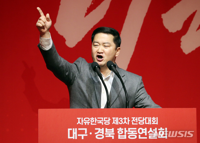 【대구=뉴시스】박영태 기자 = 18일 오후 대구 엑스코 엑스코홀에서 열린 자유한국당 제3차 전당대회 대구 경북 합동연설회에서 조대원 최고위원 후보자가 지지를 호소하고 잇다. 2019.02.18.