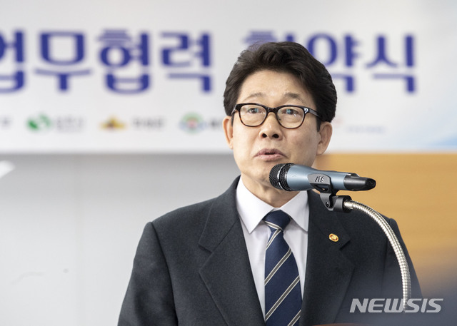 【서울=뉴시스】홍효식 기자 = 조명래 환경부 장관이 18일 오후 경상북도 상주보 사업소에서 열린 상주·낙단보 개방 추진 업무협력 협약식에 참석해 낙동강 상류 모니터링을 위한 보 개방 취지 설명과 협조 당부 등 인사말을 하고 있다. 2019.02.18. (사진=환경부 제공)