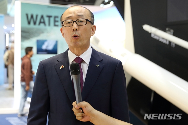 【서울=뉴시스】국방부 공동취재단 = 김지찬 LIG넥스원 사장이 18일(현지시간) 아랍에미리트(UAE) 아부다비 국립전시장(ADNEC)에서 열리고 있는 방산전시회 'IDEX(International Defence Exhibition and Conference) 2019'에서 취재진과 인터뷰를 하고 있다. 2019.02.18.