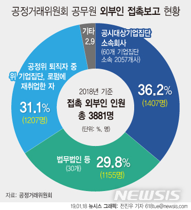 【서울=뉴시스】19일 공정거래위원회가 발표한 '외부인 접촉 관리 규정' 운영현황에 따르면 작년 1년간 누적치로 접촉한 외부인은 총 3881명이며 외부인 셋 중 한명은 대기업과 로펌에 취업한 퇴직자인 것으로 나타났다. (그래픽=전진우 기자)