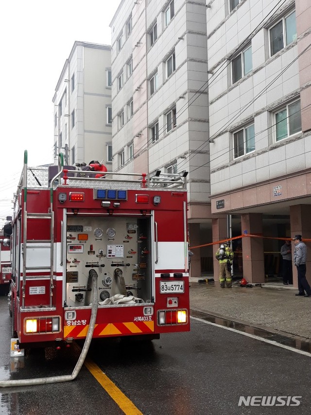 【천안=뉴시스】이종익 기자 = 19일 낮 12시 17분께 충남 천안시 서북구 두정동의 6층 높이 원룸 건물 2층에서 불이나 났다. 이날 불로 입주민 등 6명이 연기흡입으로 인근 병원에 이송돼 치료를 받는 것으로 알려진 가운데 경찰과 소방당국이 화재 원인 등을 조사 중이다. 2019.02.19.