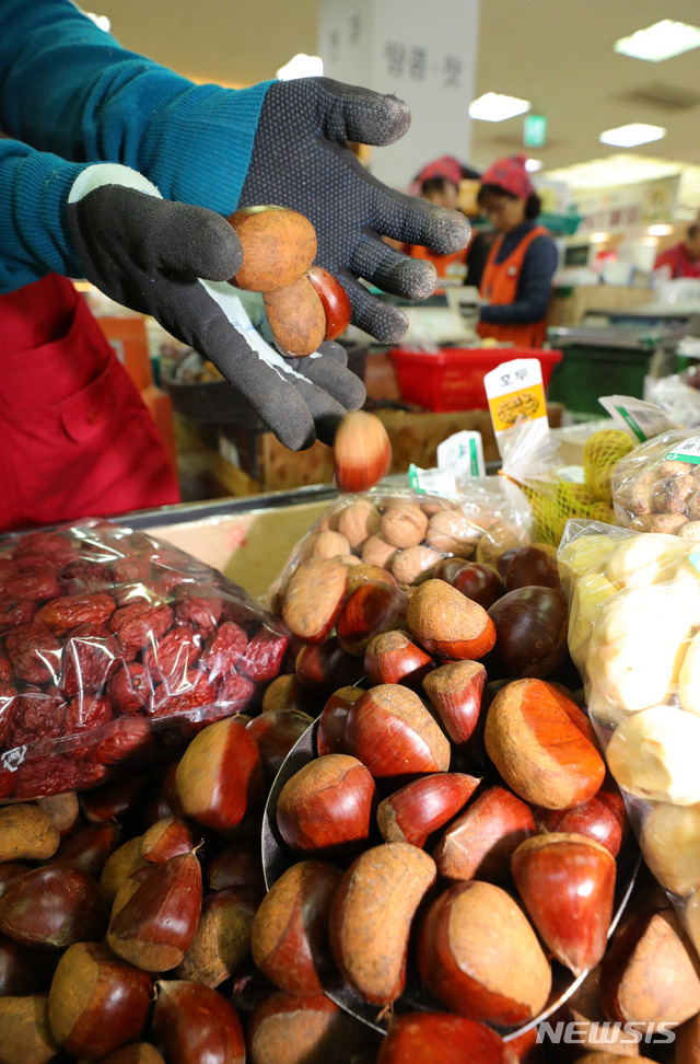 【서울=뉴시스】배훈식 기자 = 정월 대보름인 19일 오전 서울 서초구 농협하나로마트 양재점에서 밤과 잣, 땅콩 등 부럼깨기 견과류가 판매되고 있다. 2019.02.19.