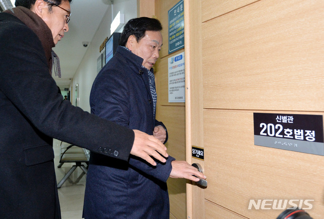 【대구=뉴시스】우종록 기자 = 정치자금법 위반 혐의 등으로 기소된 자유한국당 이완영(경북 고령·성주·칠곡) 의원이 19일 오후 항소심 선고 공판이 열리는 대구 수성구 범어동 대구지방법원 신별관 202호 법정으로 들어서고 있다. 20119.02.19.